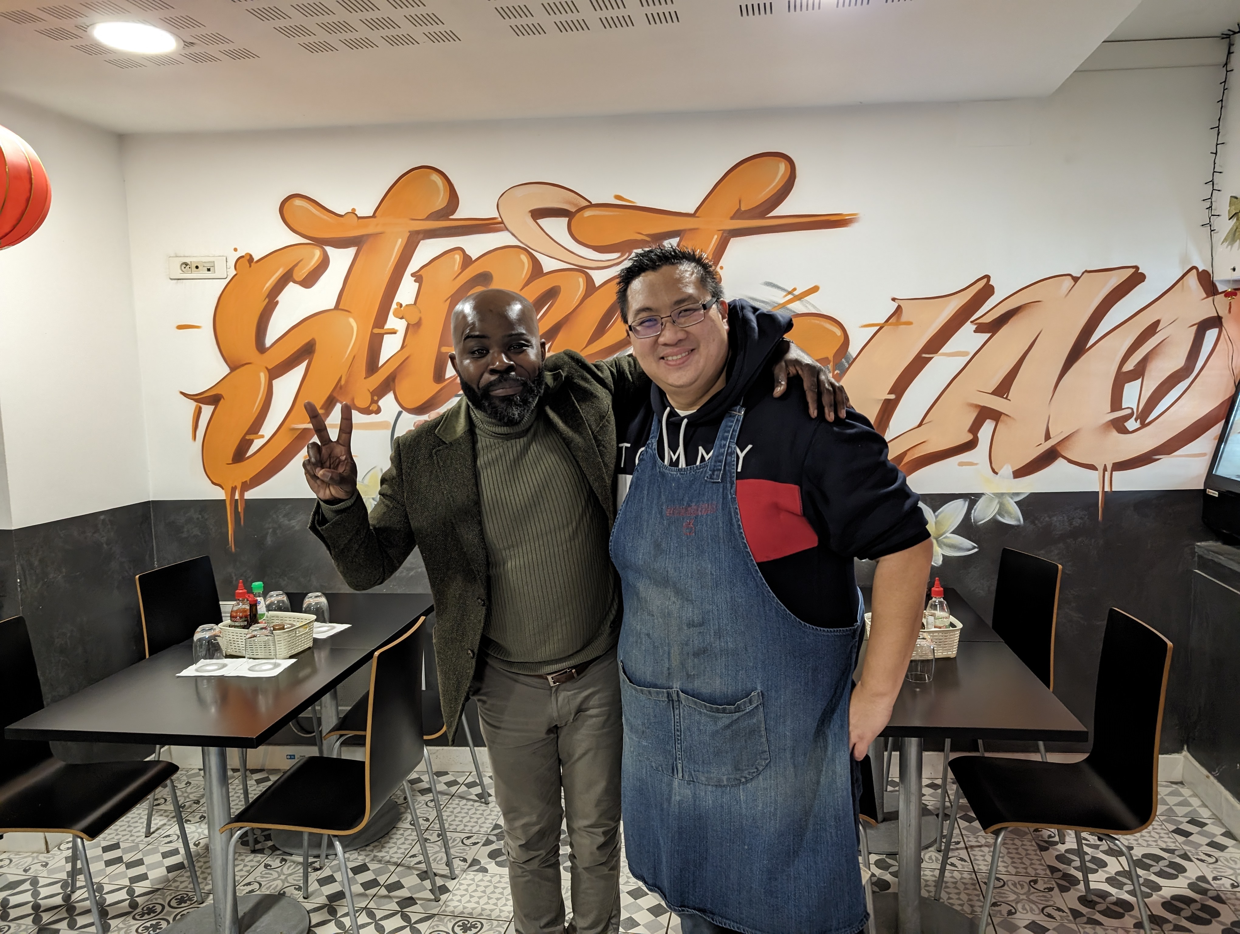 Arrivée à la devanture, on pourrait se dire, zut, j'ai sélectionné à la va vite un boui boui au ras des pâquerettes. Si vous passez votre chemin manants de Google Map, vous auriez bien tort. Street food, oui - mais au sens de ce que l'on trouve en Amérique du Sud ou certains pays d'Asie. C'est-à-dire, de très bons plats - parce qu'ils sont bien cuisinés. On a aimé. La simplicité de l'ambiance, le phin d'Isan accroché au mur, le coup de cuillère de la cuisinière, la gentillesse du monsieur, et la chaîne musicale du pays... Alors ok, il n'y a pas de patins aux pieds des chaises, mais ça valait le détour.